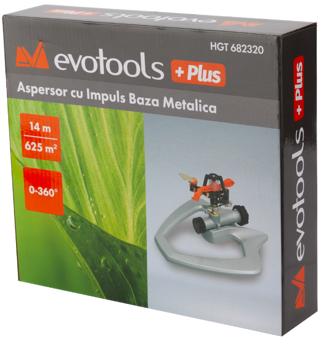 Импулсният разпръсквач с метална основа EvoTools +Plus® напоява площи до 625 m². Подавa водата като импулсен струйник с въртене 360°.