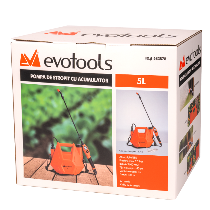 Оборудвана с акумулатор 3.7 V / 2600 mAh, помпата осигурява работна автономия до 2–2,5 часа, което я прави идеална за продължителна употреба без усилие. Максималното налягане 2.2 bar и дебитът 0.4 l/min позволяват равномерно разпръскване на течностите, осигурявайки оптимални резултати при пръскане.